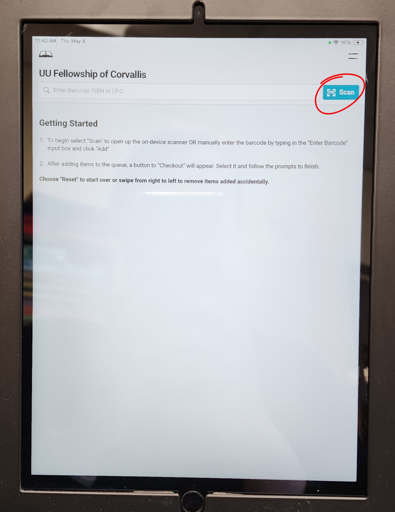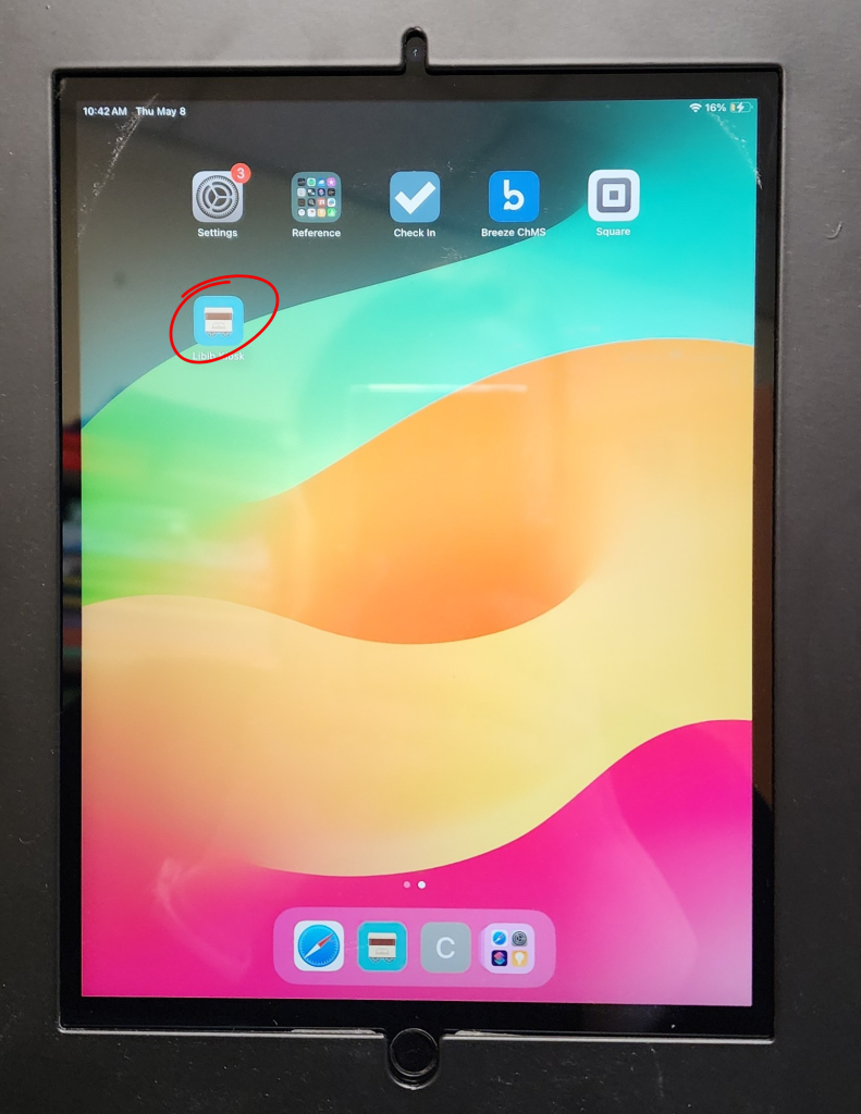 Once you’ve found the book you want to take home, you could sign it out in the check out binder OR you could use your handy dandy new library card at the kiosk! If the iPad has gone to sleep (it probably has), simply press the button at the bottom to wake it up. Then you’ll find the libib kiosk app and tap it to open.