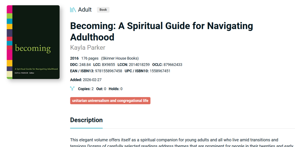 Search the catalog HERE or use the QR code on the bulletin board just inside the library door. Or, you can just browse the old-fashioned way. The resources have now been sorted into general categories. If you find something in the electronic catalog that you want to check out, you can find it on the shelf in the section indicated by the red tag. The example below is a book that can be found in the Unitarian Universalism and Congregational Life section! Please note that tags may only show up in the desktop version of the libib catalog on some devices.