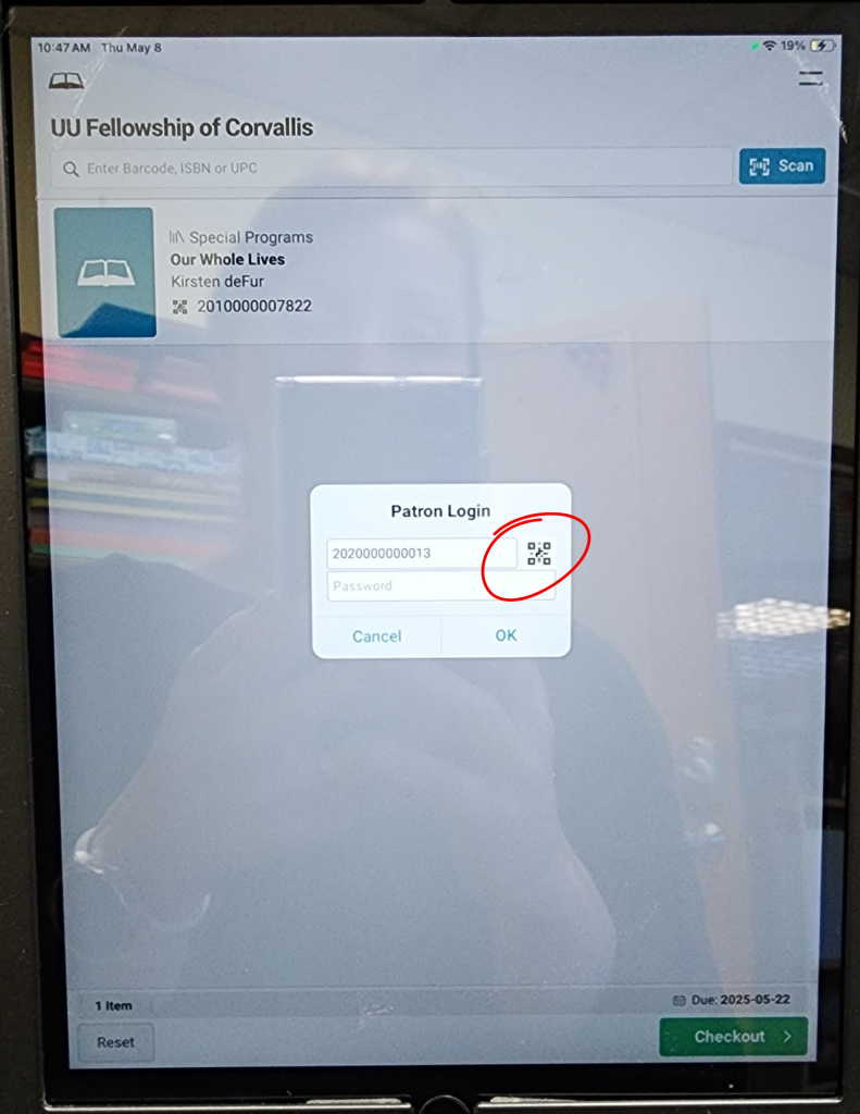 Finally! The moment you’ve waited for! The chance to use your super cool Fellowship Library Card! You could enter your patron ID in manually, but that’s so boring when you could tap the QR code and then just scan your card like you did the book.