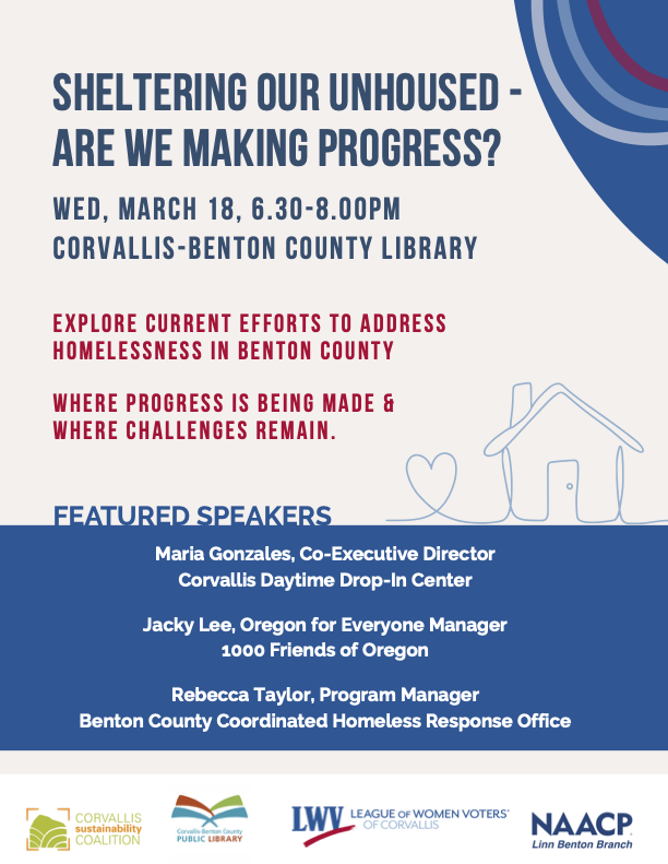 The Secure Housing and Food for All team invites you to attend a talk about current efforts to address homelessness in Benton County.