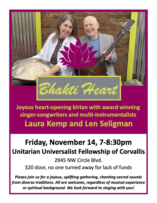 What happens when two inspiring, award-winning singer-songwriters and multi-instrumentalists join together to share their love of devotional music? The answer is the uplifting, joy-inducing duo Bhakti Heart, a collaboration between Laura Kemp and Len Seligman. Leading original and traditional sacred songs from diverse traditions, their gatherings are a heart-opening and moving experience. Their voices blend with rich harmonies, and their joy in creating music together is obvious and infectious. Both are highly accomplished musicians on several instruments, including guitar, harmonium, octave mandolin, and hand pan.